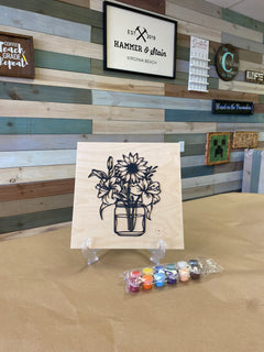 Both your wood and your personalized stencil will be placed on a work table at a reserved spot. If you requested to be seated next to a friend, you should find their design in the spot next to you. In order to protect your clothing, you will want to put on the apron provided. If you also wish to place your purse/handbag away from the work table, there is a designated area where you can safely place your things.